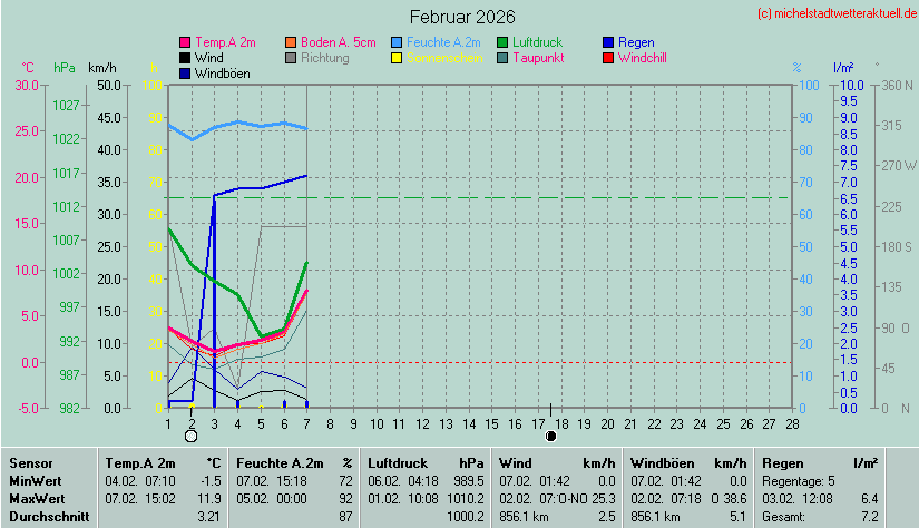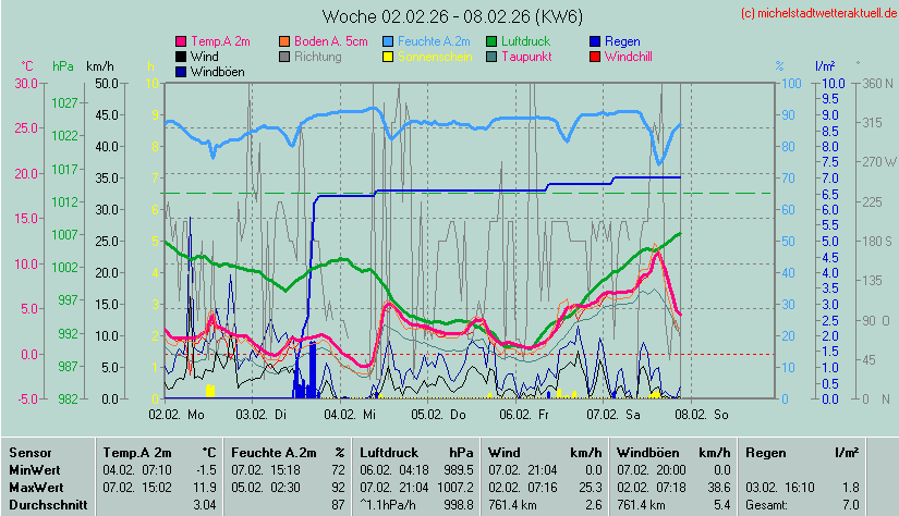 Wetterübersicht - Michelstadt 255 m über NN - 49°44'53"Nord - 8°51'3"Ost Die Minimal- und Maximalwerte beziehen sich auf die letzten 24 Stunden. Die Wetterwerte werden alle 5 Minuten aktualisiert. |